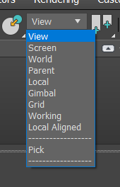 뷰포트 상단의 드롭다운 메뉴(View / World / Local / Parent / Gimbal 등)를 통해 선택할 수 있으며, 선택된 옵션에 따라 조작 축의 기준이 달라집니다.
