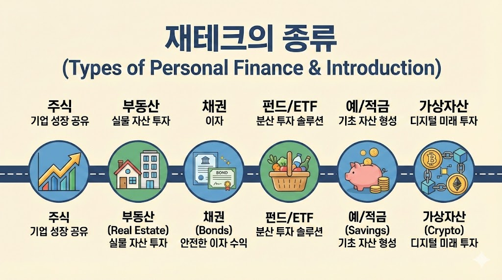 예금·적금처럼 안정적인 방법부터 주식·부동산·펀드 같은 투자 방식, 그리고 세금 절감이나 지출 관리까지도 모두 재테크에 포함됩니다.
