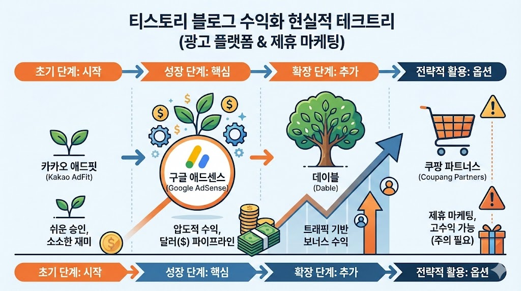 | 중·후반부 확장 조합 | 구글 애드센스 + 쿠팡 파트너스 + 데이블 |