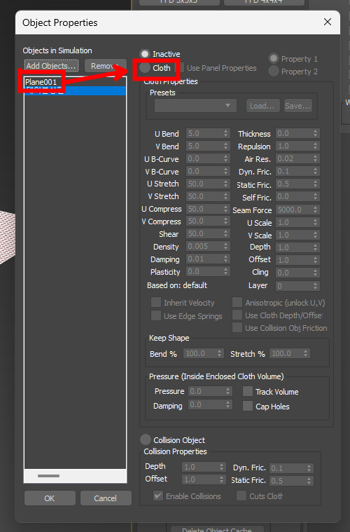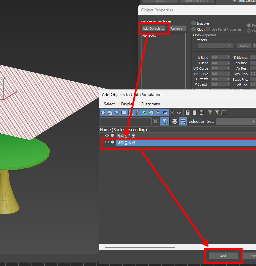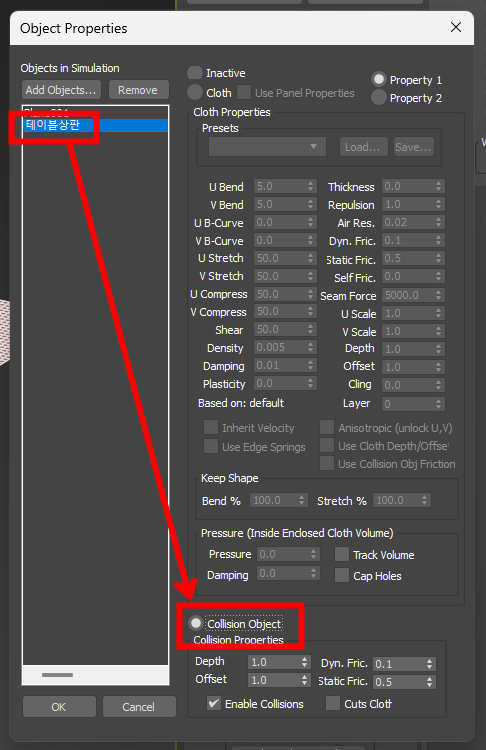 천이 될 Plane은 Cloth로 지정해주고, 천과 물리적으로 부딪히는 부분이 테이블 상판이기 때문에 테이블 상판을 추가한 다음 Collision Object(충돌 객체)로 지정해줍니다.
