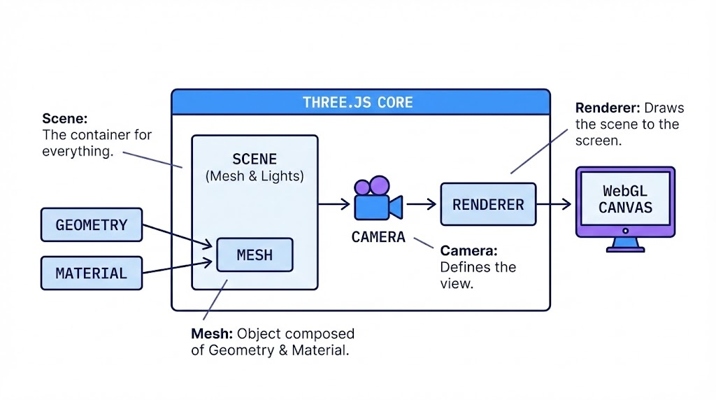 three.js를 이해하려면 가장 핵심이 되는 4가지 요소를 먼저 아는 것이 중요합니다.