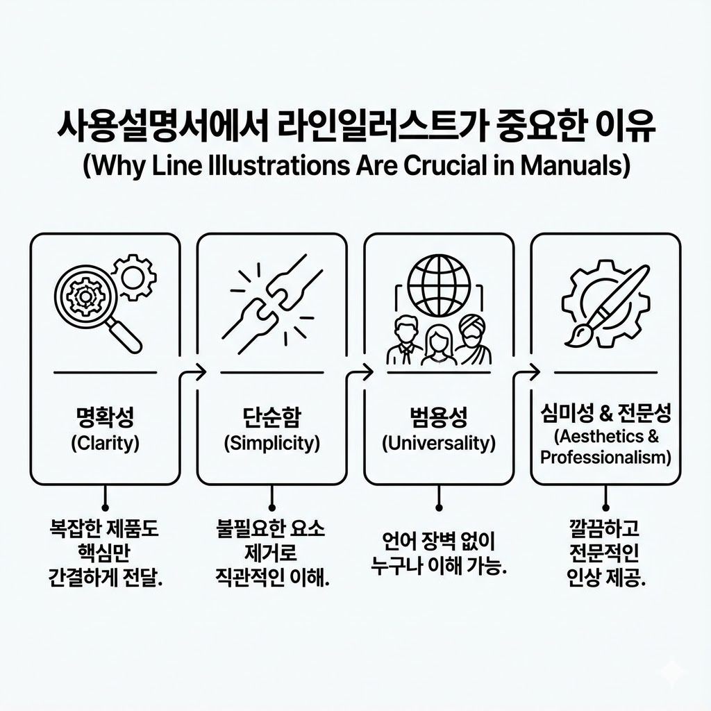 라인 일러스트는 이 목적을 가장 효율적으로 달성할 수 있는 시각적 수단이며, 단순한 장식 요소가 아닙니다.