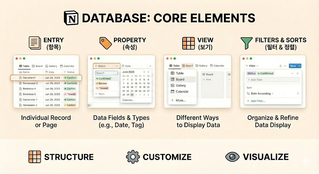 페이지 + 속성 + 보기 방식이 결합된 정보 관리 도구입니다.