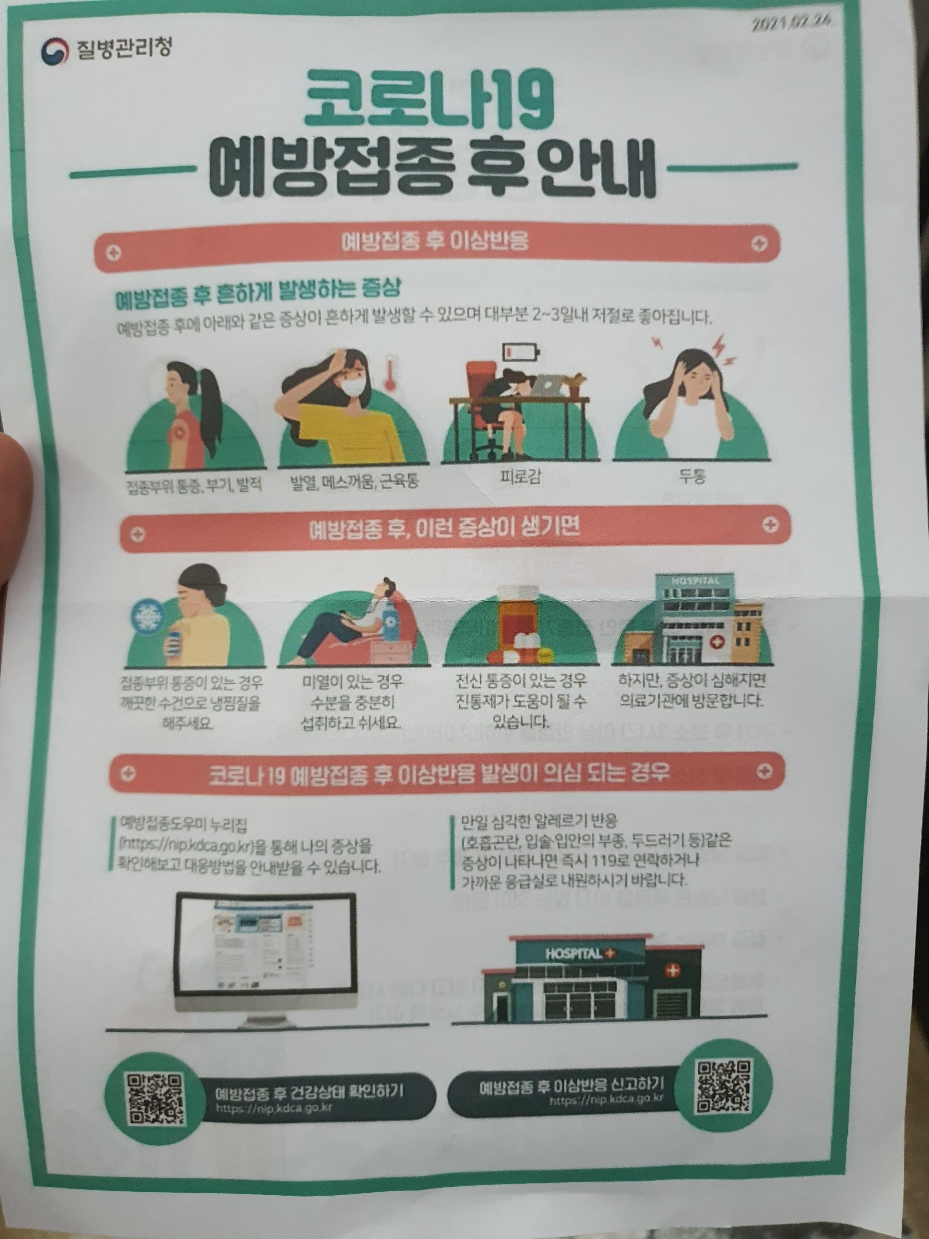 - 접종 당일 포함 3일 동안 아픈 건 정상. 4일 이후부터도 몸에 이상 증상이 보이면 응급실이나 119에 연락