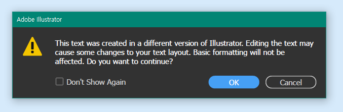 "This text created in different version of illustrator. Editing the text may cause some changes to text layout. Basic formatting will not be affected. Do you want to continue?"