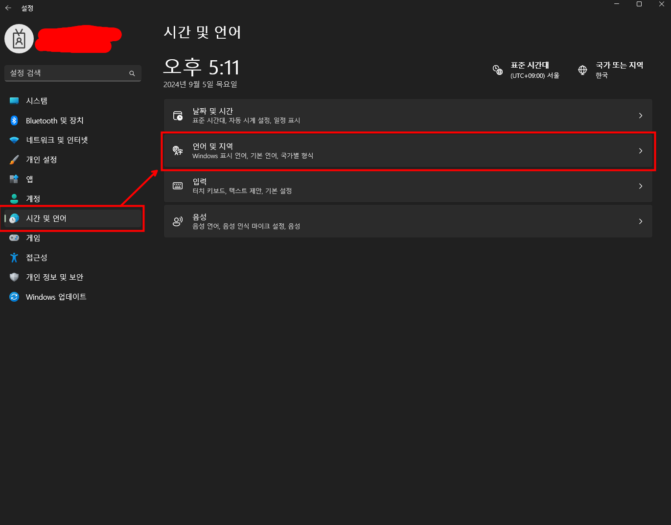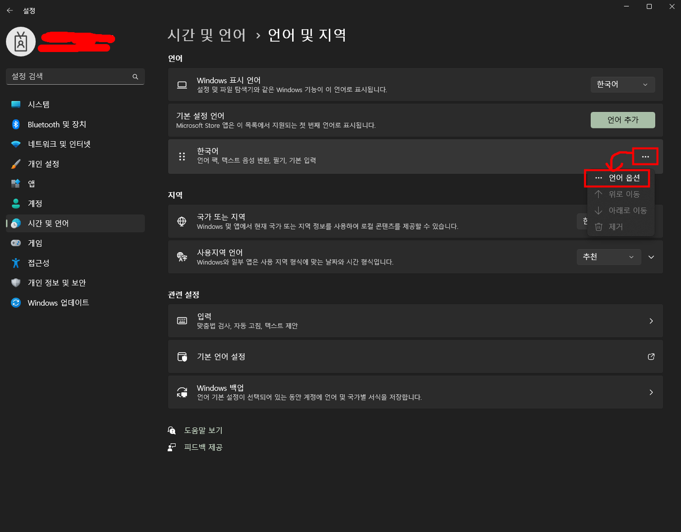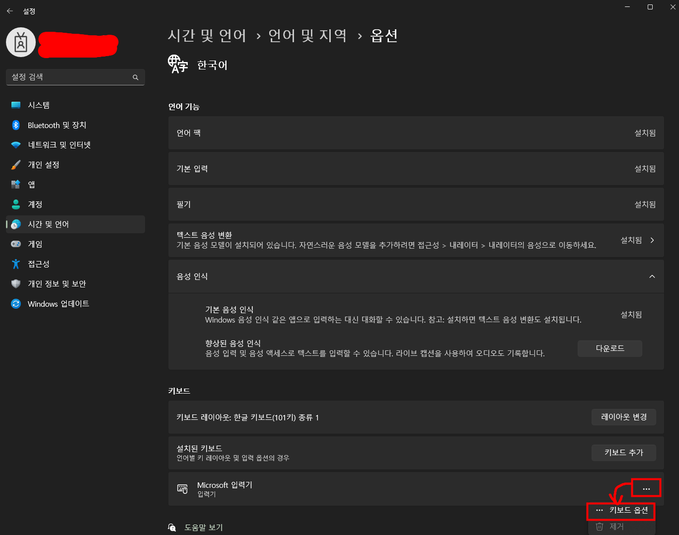 [설정 > 시간 및 언어 > 언어 및 지역 > 한국어 오른쪽 점 세개 메뉴 클릭해서 언어옵션으로 진입 > Micersoft 입력기 옆 점 세개 매뉴 클릭해서 키보드 옵션으로 진입]
