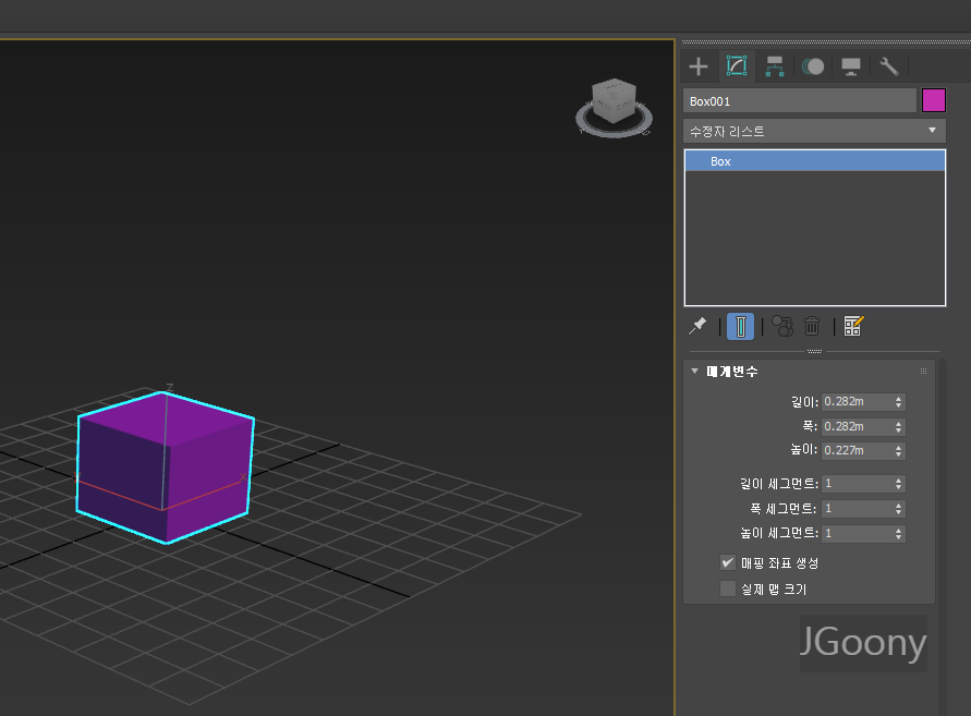 | 길이 (Length) | 박스의 세로 방향 길이를 설정합니다. | 기본 단위는 씬 단위 설정에 따름 (cm, m 등) |