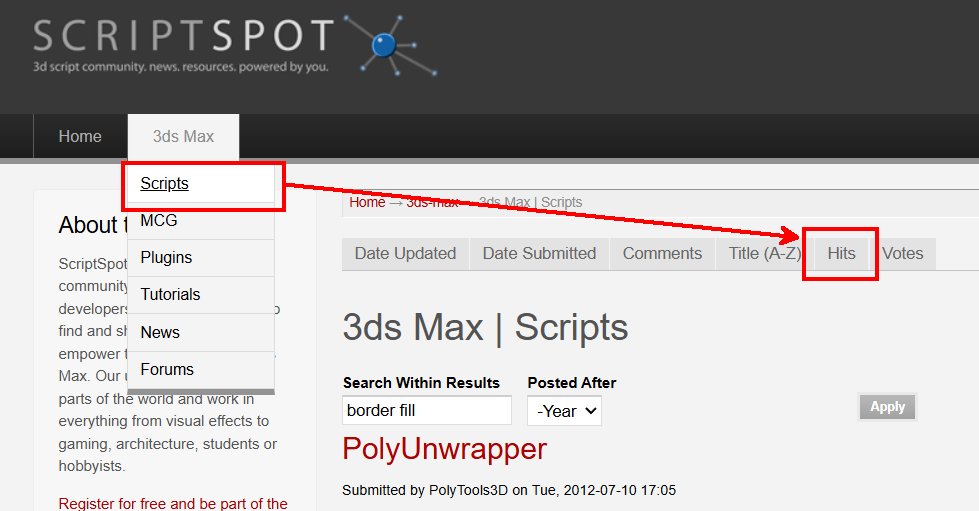 상단 3ds max 메뉴 하위에 Scripts를 클릭해서 들어가신 후 우측 상단부에 있는 Hits를 클릭하시면 가장 많이 다운로드된 인기있는 스크립트가 최상단으로 검색되어 표시됩니다.