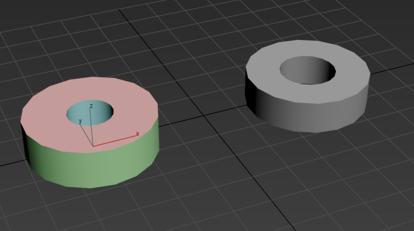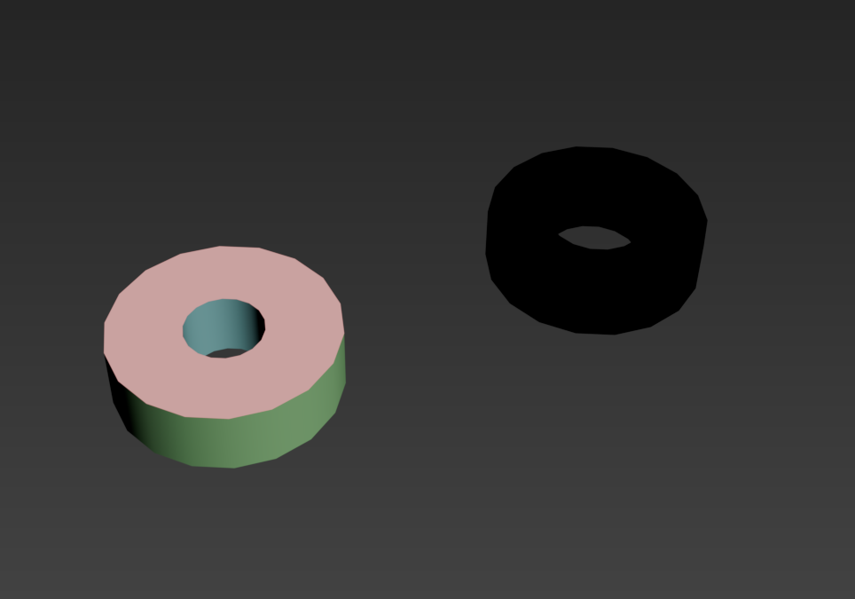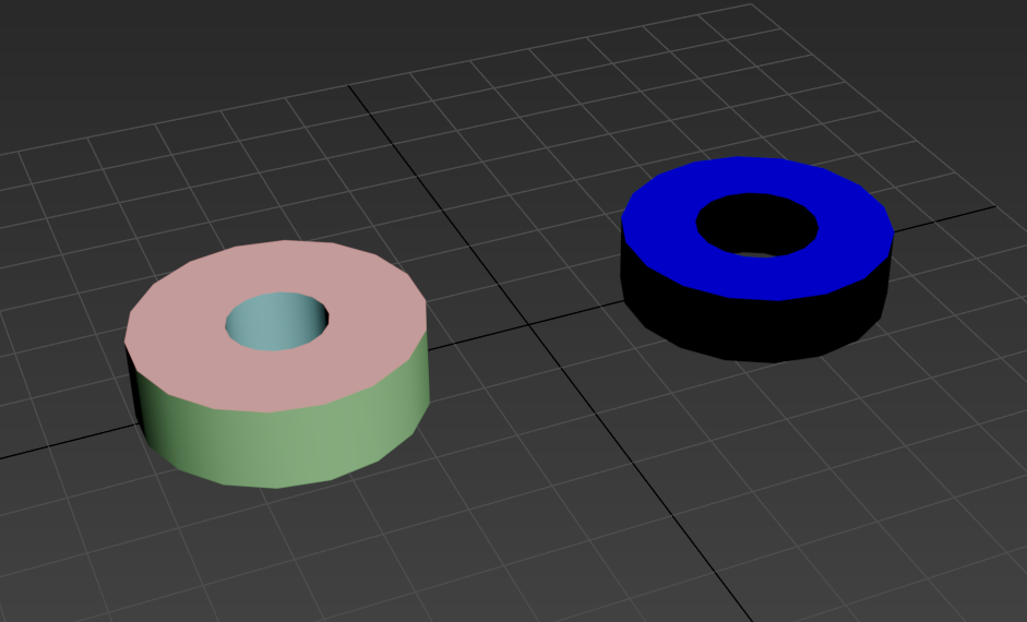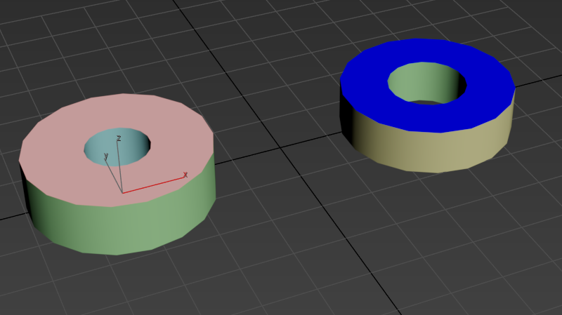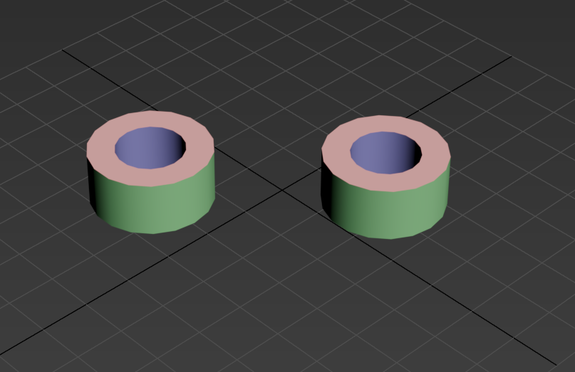 오른쪽 튜브 오브젝트의 상단면 1번 ID는 5번으로 ID가 바뀌어서 왼쪽오브젝트의 Multi/Sub-Object의 5번으로 적용됩니다. 그리고 2, 3, 4, 번 ID는 1, 2, 3번으로 자동 바뀌면서 오른쪽 오브젝트의 ID에 적용되어있는 재질이 적용됩니다.