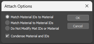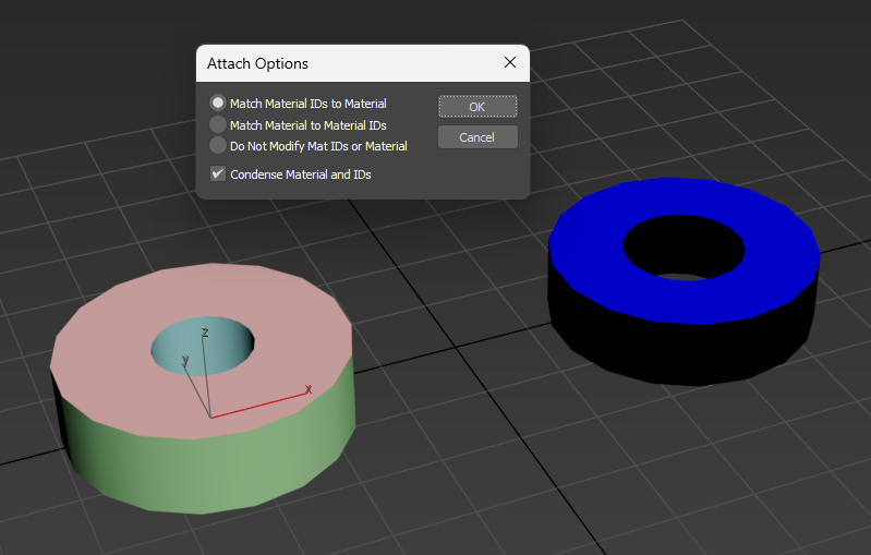 | Match Material IDs to Material | 머티리얼(특히 Multi/Sub-Object)의 슬롯 구성이 기준이 되고, 각 폴리곤의 ID가 그 슬롯 순서에 맞게 재정렬된다. 즉 “재질 우선, ID 따라가기”. | 서로 다른 출처의 오브젝트들을 합칠 때. 각자 재질 세트가 달라도 결과가 가장 안정적으로 보존되길 원할 때. | 기본 오브젝트(Attach를 받는 쪽)의 머티리얼 구성이 최우선 기준이 된다. 기본 오브젝트의 머티리얼을 신뢰할 때 선택. |
