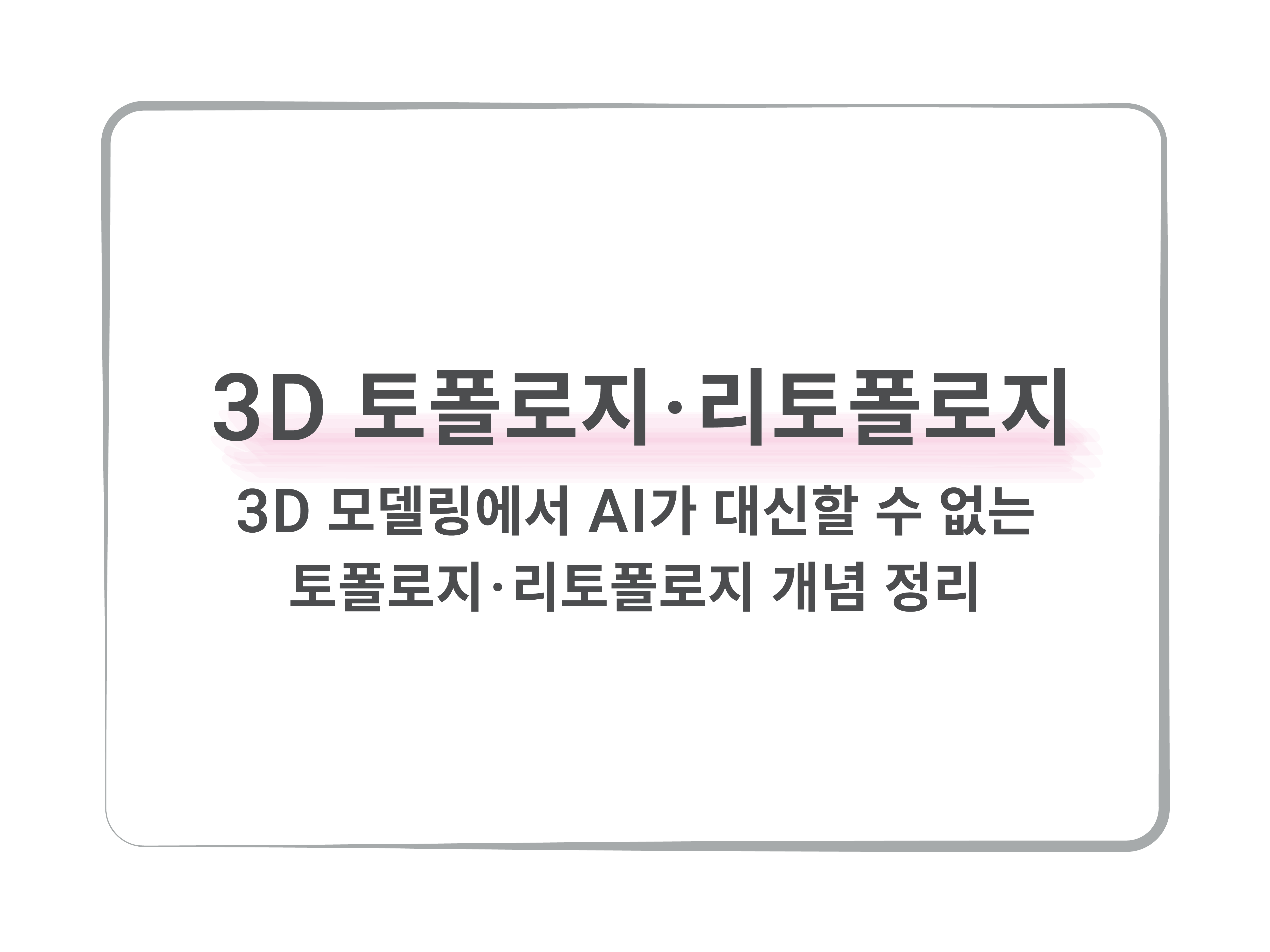 3D 모델링을 하다 보면 “형태는 멀쩡한데 왜 문제가 생기지?”라는 상황을 자주 겪게 됩니다.이때 대부분의 원인은 토폴로지에 있습니다.그리고 이 문제를 해결하기 위해 등장하는 개념이 리토폴로지입니다.3D 모델링 작업을 시작한 지 얼마 안 되는 분들은 이 두 개의 개념이 좀 헷갈릴 때가 있을 거예요.이 글에서는 토폴로지와 리토폴로지가 각각 무엇을 의미하는지, 그리고 두 개념이 어떻게 다르고 언제 필요한지까지 정리해보겠습니다.토폴로지 개념 토폴로지는 3D 모델을 구성하는 정점(Vertex), 엣지(Edge), 폴리곤(Polygon)의 연결 구조를 의미합니다.즉, 모델의 겉모습이 아니라 내부 구조와 흐름에 대한 개념입니다. 와이어프레임(그물망)의 구조라고 볼 수 있죠.같은 형태의 모델이라도 토폴로지가 어떻게 ..
